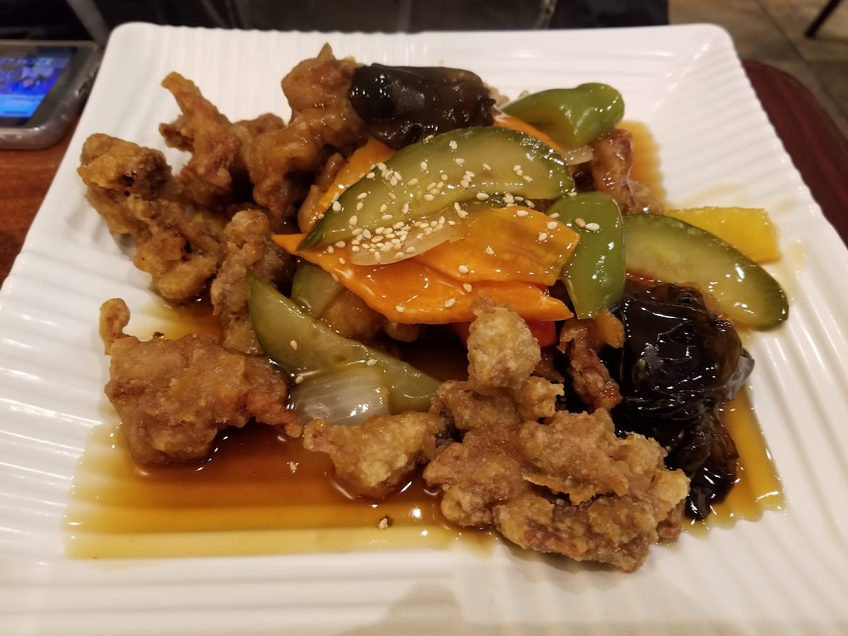 Khanpunggi is a Korean fried chicken dish that is both crispy and tender. The chicken is coated in a flavorful sauce and served with a mix of vegetables, creating a balanced and flavorful meal.